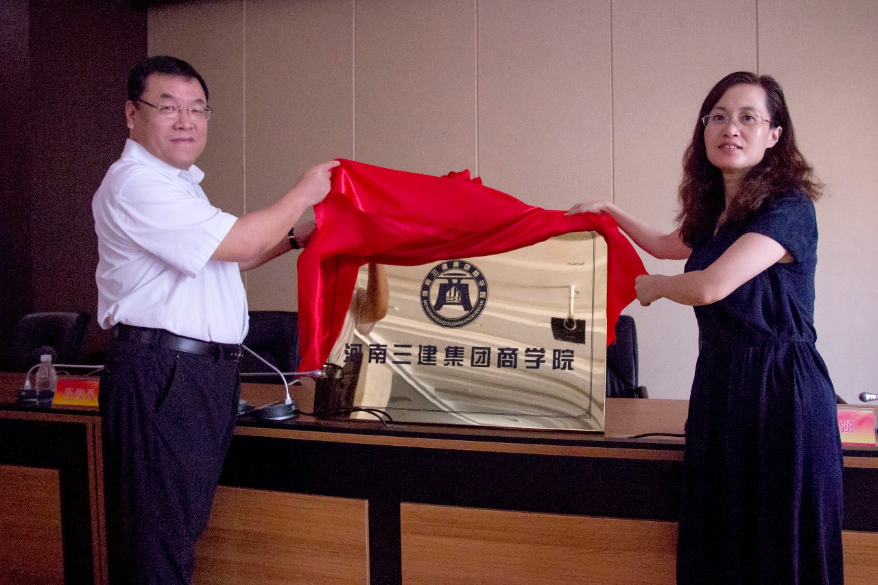 集團公司董事長、河南三建集團商學院黨委書記張超鄭重宣布——河南三建集團商學院成立,并與洛陽理工學院副校長丁梧秀教授共同為河南三建集團商學院揭牌。
